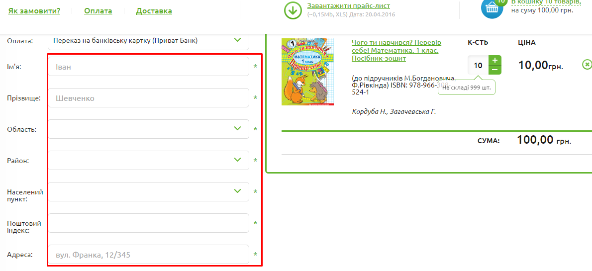 - Вкажіть необхідну контактну інформацію, оберіть спосіб доставки та оплати.