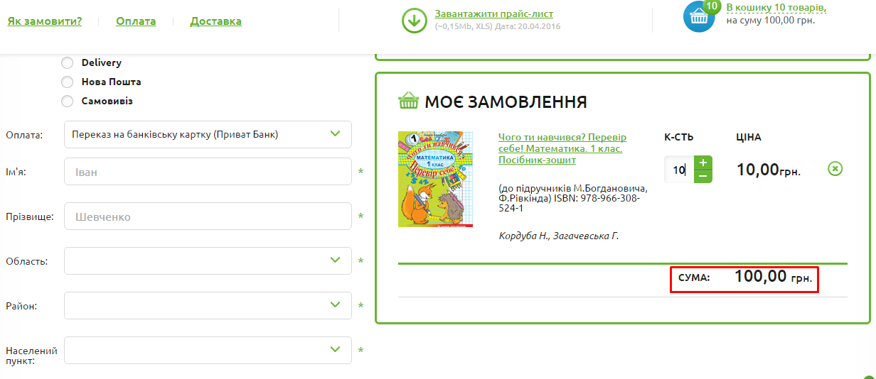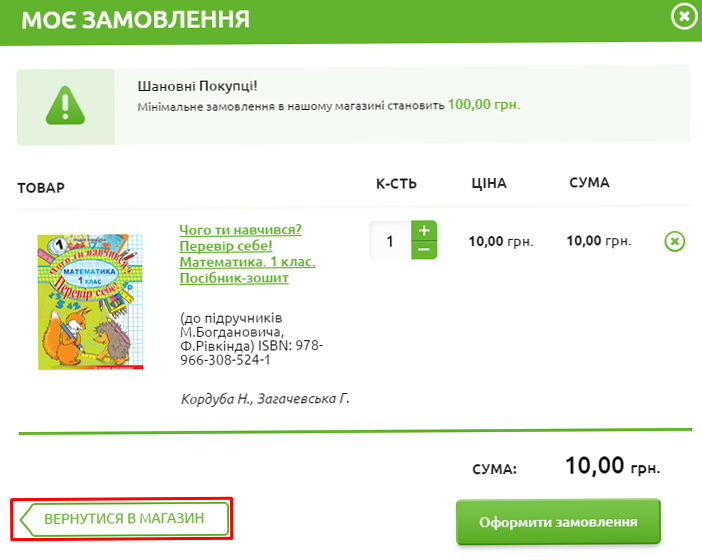 - Натисніть на кнопку "ОФОРМИТИ" і побачите вміст Вашого кошика та загальну вартість замовлення. Тут Ви також можете обрати необхідну Вам кількість примірників.